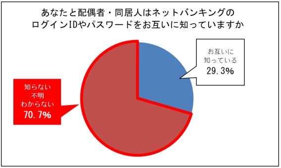 その一方で、インターネットバンキングを利用している世帯のうち、お互いのIDやパスワードを把握していない割合は70.7%に上り、家族のキャッシュカードの暗証番号を把握していない割合の56.3%を上回る結果に。