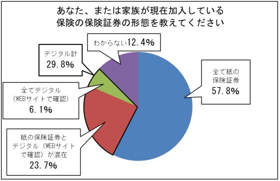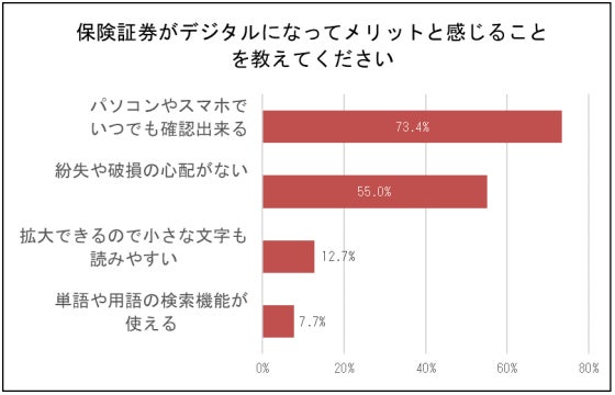 近年では銀行口座と同様、保険証券もデジタル化が進みつつあります。今回の調査では、「紙とデジタルが混在」「すべてデジタル」という人を合わせると29.8%の人が実際にデジタル証券を利用していました。依然、紙の証券の利用者が多いものの、デジタル証券について、55.0%が「紛失や破損の心配がない」、73.5%が「パソコンやスマホでいつでも確認できる」と答えており、多くの人が管理のしやすさにメリットを感じていることがわかります。