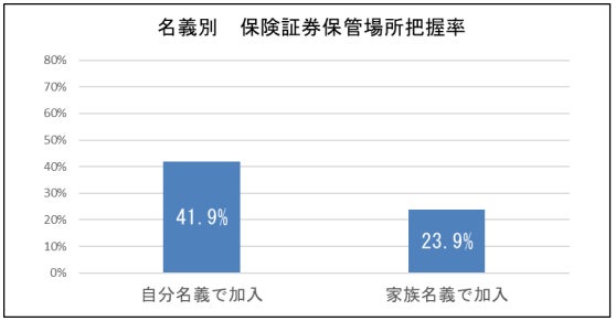 自分名義で加入している保険については、保険会社名や共済名を把握している人が67.9%だったのに対し、家族の名義で加入している保険会社・共済名を把握している人は44.4%という結果に。さらに、保険証券の保管場所を把握しているかという質問に対しても、自分名義の保険を把握しているのは41.9%なのに対して、家族名義の保険については23.9%の人しか把握していませんでした。
