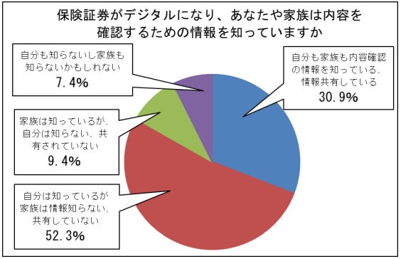 自分名義で加入している保険については、保険会社名や共済名を把握している人が67.9%だったのに対し、家族の名義で加入している保険会社・共済名を把握している人は44.4%という回答結果に。さらに、普及が進むデジタル証券のIDやパスワードなどの把握状況に関しては、家族に伝えていない人が52.3%と半数以上の回答結果に。