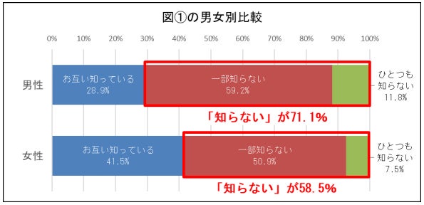 家計(家族の生活費、教育費、住宅費など)を「自分と共に配偶者、同居者も負担している」と答えた人は全体の42.3%でした。しかし、お互いの収入について「すべて知っている」と答えた人は全体の35.2%にとどまり、残る64.8%は「一部知らない・わからないことがある」または「お互いひとつも知らない」と回答しています。 男女別に見ると、男性の71.1%、女性の58.5%が、お互いの収入を把握していないという結果に。