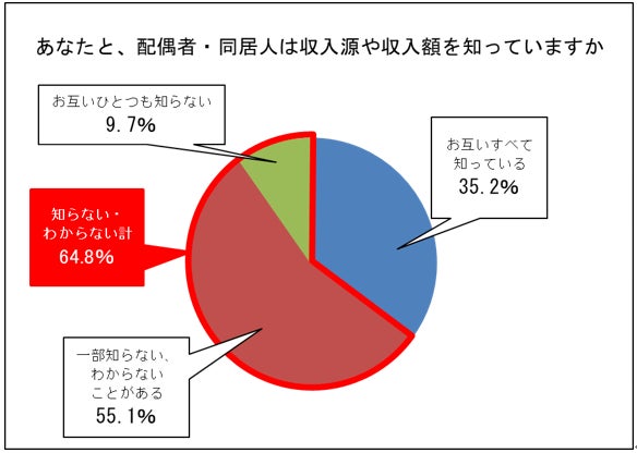 家計を「自分と共に配偶者、同居者も負担している」と答えた人は全体の42.3%。お互いの収入について「すべて知っている」と答えた人は全体の35.2%にとどまり、残る64.8%は「一部知らない・わからないことがある」「お互いひとつも知らない」という回答結果に。