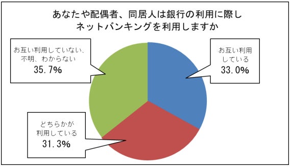 また、近年ではインターネットバンキングの普及が進み、銀行口座もスマホ一つで管理できるようになっています。実際に今回の調査では、全体の64.3%の人が、自身と配偶者・同居人のどちらかまたはお互いがインターネットバンキングを利用していると回答しました。